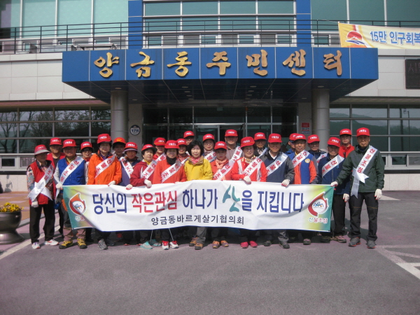 이들은 아침 일찍 양금동 주민센터에 집결하여 양천동 배수펌프장에서 양금폭포 앞, 하로, 양곡 천, 새천년 숲을 이르는 코스로 소각행위 금지 등 산불예방홍보 전단지를 배부하면서 길가에 버려진 생활쓰레기, 담배꽁초 등을 수거했다.