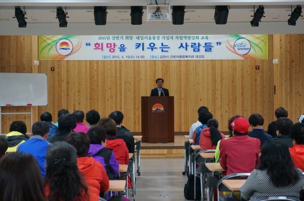 김천시(시장 박보생)는 4월 15일 근로자종합복지관 3층 대강당에서 희망·내일키움통장 가입자 100여명이 참석한 가운데 "희망을 키우는 사람들"이라는 제목으로『희망·내일키움통장 가입자에 대한 자립역량 강화 교육』을 실시했다.