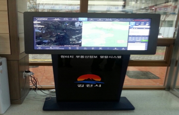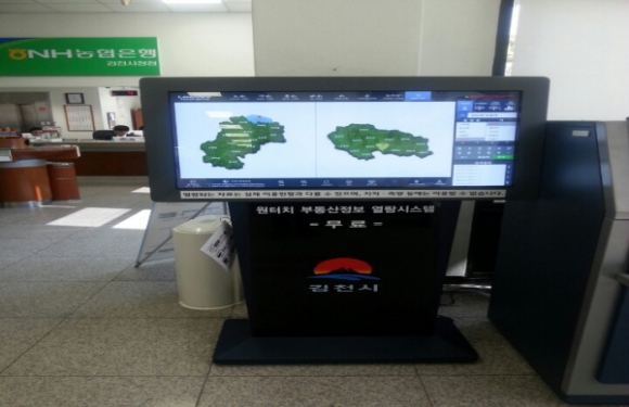 김천시(시장 박보생)는 부동산정보의 활용도를 높이기 위하여 지난 4월 20일 율곡동, 구성면 ~ 증산면 6개소에 대하여 공간정보 민원열람시스템을 설치했다고 전했다. 각종 부동산정보를 열람할 수 있고, 새주소(도로명주소) 검색이 가능한 『원-터치 부동산정보열람시스템』이다.