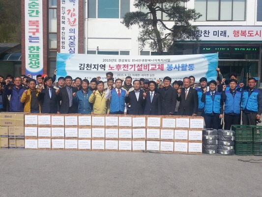 상북도와 김천시가 주최하고 김천시 전기공사협회가 주관하는 노후전기설비 교체 봉사활동이 4월 22일 지례면과 대덕면 기초생활수급자 40가구를 대상으로 실시되었다.
