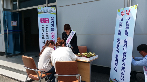 찾아가는 현장이동민원실 운영은 4월 22일부터 5월 10일까지 관내 기업체 및 단체 등을 직접 현장 방문하여 전입신고 현장접수, 주요시정 홍보, 기업체 및 단체 애로사항 청취, 인구전입 등 당면현안사항 홍보를 추진할 예정이며, 전입자에 대하여는 김천시에서 지원하고 있은 전입지원금, 쓰레기봉투 지급 외에도 어모면에서 자체 준비한 기념품(다육이화분)을 증정하고 있다.