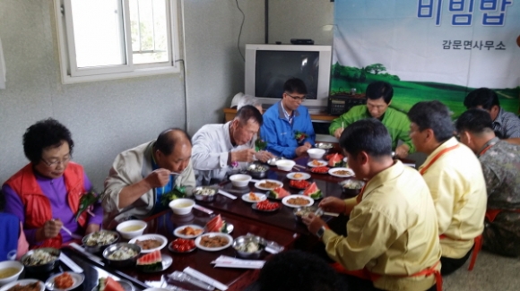 “주민 화합·소통을 위한 양푼 비빔밥데이”는 마을을 찾아가 면에서 준비한 대형 양푼에 밥과 각종 반찬을 넣고 즉석 비빔밥을 만들어 마을주민들과 직원들이 다 함께 점심식사를 하는 소통의 자리이다.