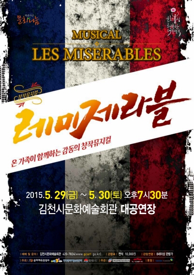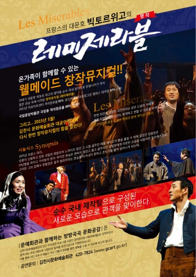 |  | | | ⓒ 김천내일신문 | | 국내 제작진에 의해 2008년에 초연하여 2014년까지 총 50만 관객을 돌파한 ‘창작뮤지컬 레미제라블“이 오는 2015년 5월 29일, 30일 오후 7시 30분 문화예술회관(대공연장)에서 선보일 예정이다.