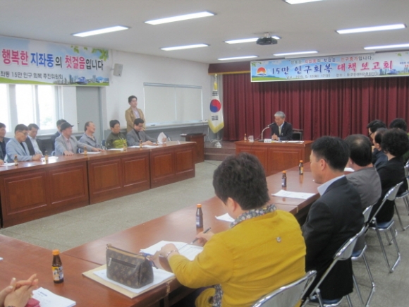 이날 보고회에서 서정하 안전행정국장은 ‘지역특성에 맞는 인구유입 추진계획을 마련하여 인구회복추진위원회와 통장, 공무원이 혼연일체가 되어 15만 인구회복 범시민 추진운동에 적극 매진‘하여 줄 것을 당부하였다