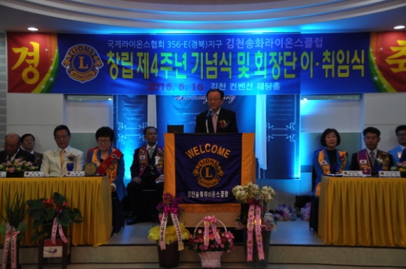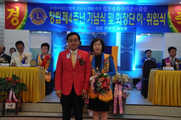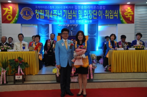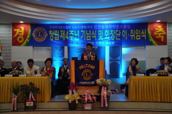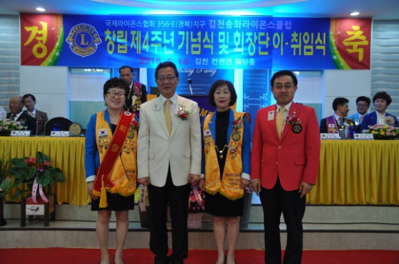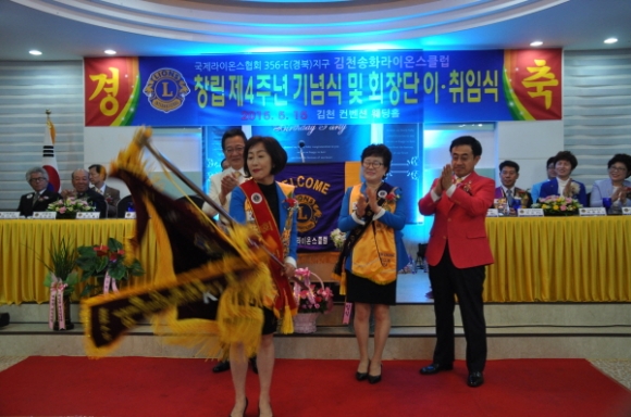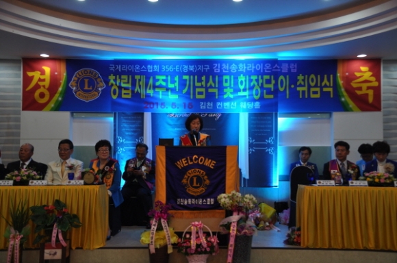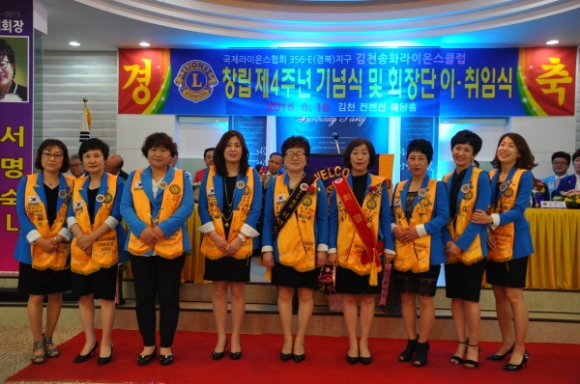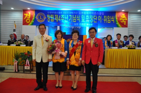 국제라이온스 협회 356-E 경북지구 김천송화 라이온스클럽(회장 배정희)는 5월15일 컨벤션웨딩에서 회원과 가족둘이 참석한 가운데 “창립4주년 기념식 및 제4대,제5대 회장 이.취임식을 가졌다.
