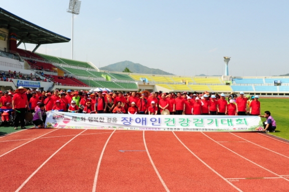 |  | | | ⓒ 김천내일신문 | | 김천시 종합운동장에서 지난 5월 19일 오후2시 장애우를 위한 제6회 행복한 걸음 장애인 건강 걷기대회가 박보생 김천시장, 이철우 국회의원, 나기보 도의원을 비롯한 장애인과 가족 등 약 1,000여명이 참석한 가운데 김천시장애인생활체육회 주최로 성황리에 개최되었다.