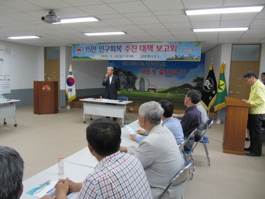 김천시 감문면(면장 김대균)에서는 지난5월22일 면사무소 회의실에서 서정하 안전행정국장과 김세운 예산결산특별위원장, 김윤현 인구회복추진위원회 위원장 및 위원, 이장과 관내 기관단체장 50여명이 참석한 가운데 15만 인구회복을 위한 대책보고회를 가졌다.