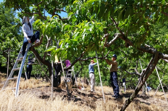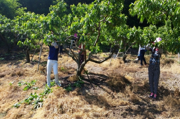 이날 일손 돕기는 농업인구 감소와 고령화에 따른 부족한 노동력에 힘을 보태기 위해 지역보건과 직원 10여명이 양금동(하로마을)에 위치한 김모씨 농가의 복숭아 과수원 적과 작업을 도왔다.