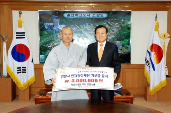 |  | | | ⓒ 김천내일신문 | | 2018년까지 200억원의 기금 조성을 목표로 하고 있는 김천시인재양성재단(이사장 박보생)에 시민․단체, 출향인사 등 각계각층에서 후원의 손길이 끊이지 않고 있는 가운데, 5월 27일 직지사 중암 주지 도진스님께서 지역의 우수한 인재양성을 위해 사용해 달라며 300만원을 김천시인재양성재단에 기탁했다.