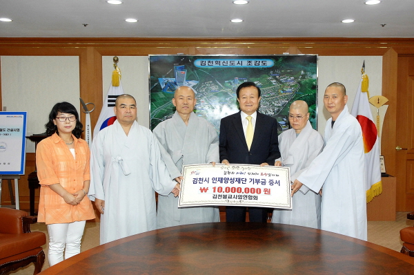 김천시 미래를 위한 우수인재육성과 김천교육발전을 위해 조성 중인 김천시인재양성재단(이사장 박보생)에 김천 불교 사암연합회(회장 고방사 주지 성현스님)에서 지난 6월 1일 오후 김천시청을 방문하여 장학기금 1천만원을 기탁했다.