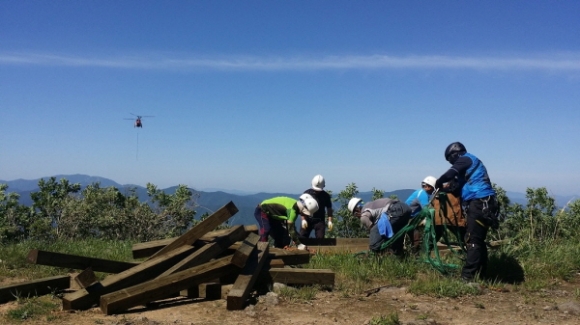 김천시 부항다목적댐에서 삼도봉까지 총 9회에 걸쳐 등산로 정비사업에 필요한 자재(목재 10톤)를 대형헬기로 운반했다.