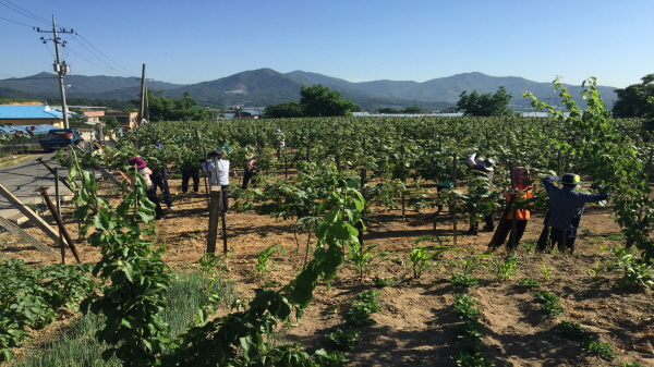 아울러 새참을 먹는 시간에 농민들의 애로사항을 청취하고 시정에 참여와 협조를 당부하는 등 대화와 소통의 시간을 가졌다. 농장주인 윤종두이장은 “포도순 작업은 손이 많이 가는 작업이라 일손이 부족해 어려움이 많은데 바쁜 업무에도 불구하고 공무원들이 내일처럼 열심히 일해줘 큰 도움이 됐다”며 고마워했다.