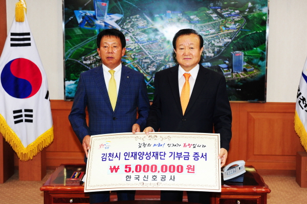 김천시 미래를 위한 우수인재육성과 김천교육발전을 위해 조성 중인 김천시인재양성재단(이사장 박보생)에 한국신호공사(대표 김덕수)에서 6월8일 시청을 방문하여 장학기금 5백만원을 기탁했다.