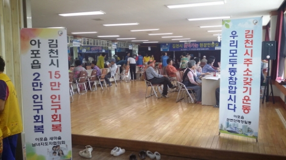 아포읍 이장협의회(회장 김동수)에서는 매달 정기적으로 개최되고 있는 이장회의에 앞서 유동인구가 많은 농협과 택지개발지역을 돌면서 전입홍보 전단지를 배부하면서 인구증가 가두 캠페인을 전개하였으며 특히 아포읍회의실에 행사 중인 “찾아가는 현장 민원실”을 방문하는 주민들에 대하여도 아포읍 인구15만회복 운동에 다같이 주민모두가 동참하자고 인구전입 홍보활동을 전개하였다.