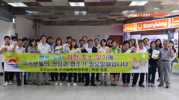 |  | | | ⓒ 김천내일신문 | | 지난 6월 13일 오후 김천역에서는 휴일임에도 불구하고 평화남산동 추진위원, 통장, 직원들을 비롯한 행정담당 주민생활지원과 직원 50여명이 등이 올해 김천시 중점 역점시책인 인구회복 운동과 관련하여“김천시 주소 갖기 캠페인 ”을 전개하면서 인구회복에 총력전을 펼쳤다.