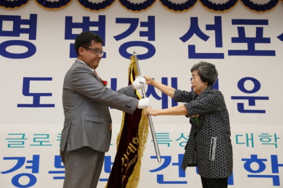 1부 행사는 김승환 입학홍보처장의 사회로 대학 교문에서 현판 제막식이 진행됐고, 교내 목인관 시청각실에서 열린 2부 행사는 개식선언, 국민의례, 내빈소개, 경과보고, 환영사, 축사, 교명선포(CI 소개 및 교기 수여), 발전기금전달식, 교가제창 등의 순으로 진행됐다.