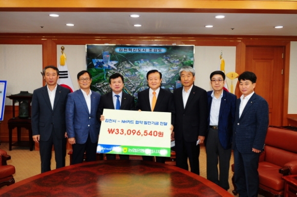 김천시(시장 박보생)는 6월 22일 농협은행김천시지부(지부장 이석하)로부터 지난해 법인(신용)카드 사용으로 발생된 3천 3백만원의 인센티브(포인트)를 전달받았다.이날 전달받은 발전기금은 농협카드사와 김천시의 신용카드 이용 약정(2011년5월31일)에 따른 것으로 법인 제휴카드 사용액에 따라 0.5 ~ 1%의 포인트를 적립하여 연1회 시에 세입조치하고 있다.
