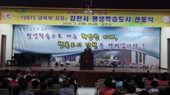 김천시(시장 박보생)는 지난 7월 2일 종합사회복지관 대강당에서 김천시장, 평생교육기관․단체, 시민 등 400여명이 참석한 가운데 “김천시 평생학습도시 선포식”을 개최했다고 전했다. 이번 선포식은 박보생 김천시장의 민선6기 취임1주년의 성과로써 김천시가 교육부로부터 평생학습도시로 지정되었음을 대내외에 공표하여 명품교육도시로서의 위상을 정립하고 평생학습도시 주민으로서 자긍심 고취와 주민의 자발적 참여를 확산하기 위해 마련됐다.