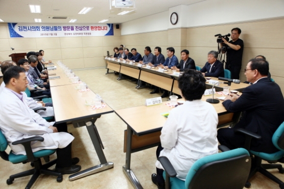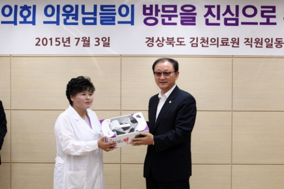 지난7월3일 메르스 관련 경상북도내 거점병원인 김천의료원을 찾아 의료관계자들의 애로사항을 청취하고 노고를 격려하면서 메르스로부터 안전한 청정 지역이 지속될 수 있도록 노력해 줄 것을 당부했다.