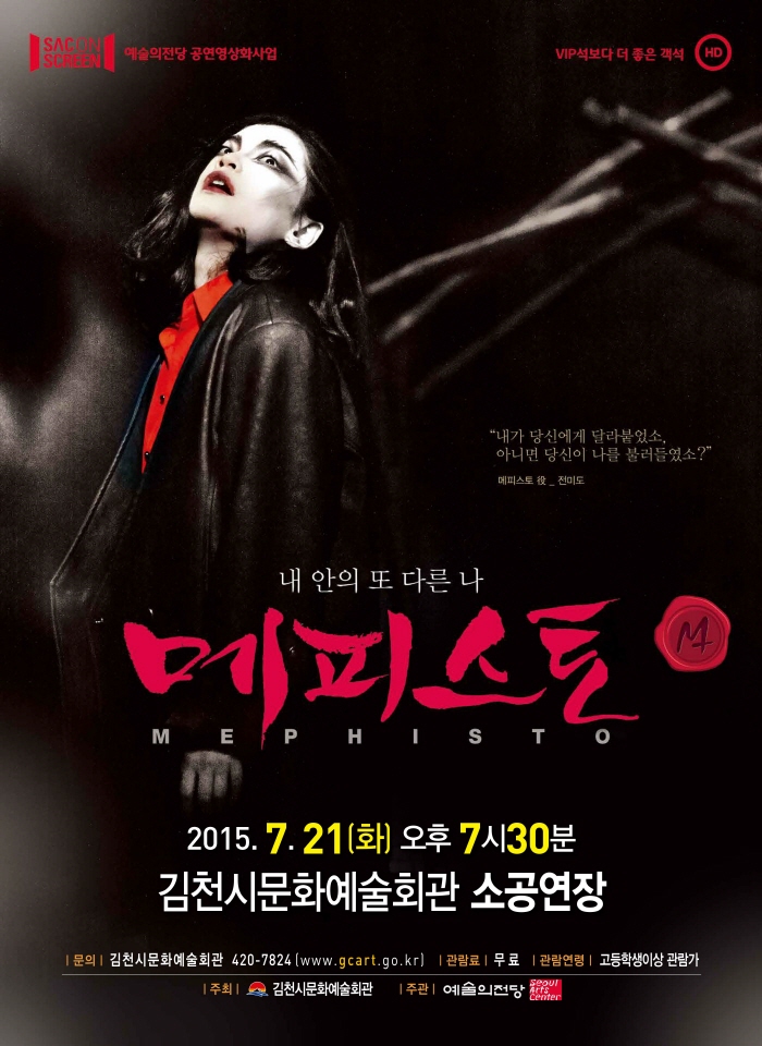 스크린에 펼쳐지는 연극 ‘메피스토’는 2014년 예술의 전당 토월극장에서 공연했던 작품을 10대 이상의 카메라로 촬영하여 생동감 넘치는 고화질 영상미와 현장감을 느끼며 관람할 수 있도록 한 것이다.