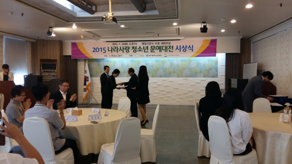 |  | | | ⓒ 김천내일신문 | | 김천여자고등학교는 매일신문사에서 주최한 제2회 나라사랑 청소년 문예대전에 김천여고(교장 문태균) 1학년 학생들이 참가하여 25명의 학생이 개인상 수상자로 입선하고, 학교가 고등부 우수단체상 수상교로 선정되어 매일신문사장상과 상금 100만 원을 받게 되었다고 밝혔다.