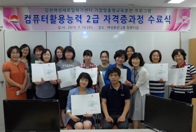 |  | | | ⓒ 김천내일신문 | | 김천시(시장 박보생)에서 운영하는 여성새로일하기센터(종합사회복지관 내)에서는 지난 7월 15일 여성회관 컴퓨터실에서 컴퓨터활용능력 2급 자격증과정에 대한 직업교육훈련 수료식을 개최했다.