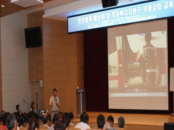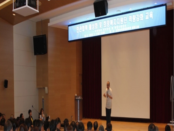 먼저, 강위원 광주시 더불어樂 노인복지관 관장이 ‘민·관 협력의 뿌리는 신뢰다’라는 주제로 열강을 하였는데, 특히 “지속가능한 복지는 본래 마을이 가지고 있는 복지 자연력, 즉, 스스로 돕고 나누는 상부상조의 마을공동체가 이루어질 때 가능하고 이를 위해 주민이 직접 복지의 주체로 당당하게 나설 수 있도록 도와야 하며, 마을 내에서 주민들과 오래도록 신뢰를 쌓아가는 복지리더 양성이 중요하다”는 것에 대해 현장사례를 들어 깊이 있고 재미있게 강의했다.