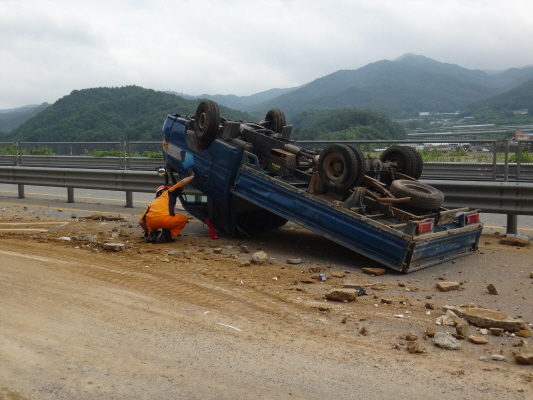 김천소방서 출동대가 사고현장에 소형화물차 1대가 전복되어 있는 상황으로 구조대원들은 차량 내에 운전자 1명을 충전식절단기 등 유압구조장비를 사용해 차량 문을 개방하여 구조하고 응급처치를 실시한 후 인근병원으로 신속히 이송했다.