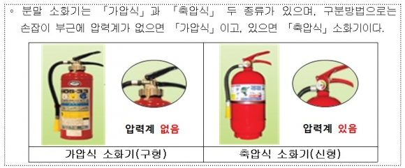신형(축압식)소화기는 압력계가 달려있어, 압력계 바늘이 초록색을 가리키면 정상상태임을 확인할 수 있다.