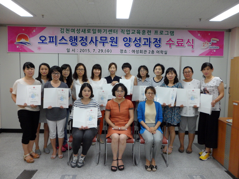 |  | | | ⓒ 김천내일신문 | | 김천시(시장 박보생) 여성새로일하기센터는 지난 7월 29일 여성회관에서 직업교육훈련 프로그램으로 실시한 “오피스행정사무원 양성과정” 수료식을 가졌다.