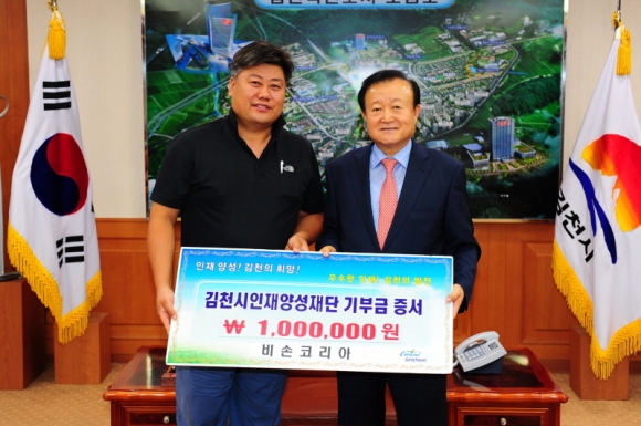 지난 8월 3일 2층 접견실에서 김종철 비손코리아 대표는 “혁신도시의 성공적 건설로 새로운 도약을 준비하고 있는 김천시에 우수한 인재육성에 적극 동참하고자 장학기금 1백만원을 기탁하게 됐다”고 말했다.
