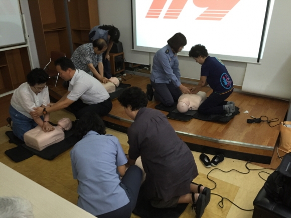 특히, 이번 교육에는 생명지킴이「119수호천사」 대원들이 6명 함께하여 교육생들의 심폐소생술 요령 등 실습을 지도했다.