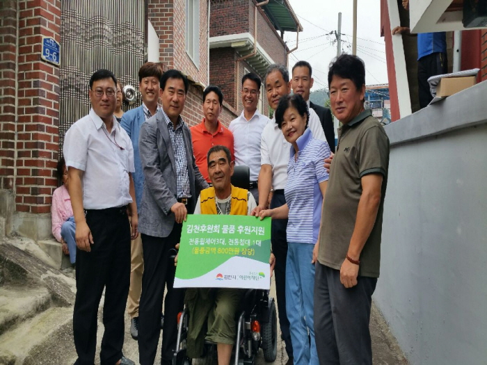 이날 초록우산 어린이 재단 경북지부 김천지회장(김장록)과 회원들이 참석한 가운데 무더운 날씨에도 불구하고, 대상 가구들을 직접 방문하여 전동침대외 3개의 보장구를 전달하고, 격려를 아끼지 않았다.