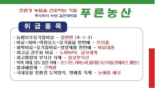 ㈜누보 김천대리점인 푸른농산에서는 지역의 농업발전을 위해 시료사업 및 전시포 시범포 사업을 꾸준히 진행해왔으며 기존 유박 및 비료와는 차별화 된 “트리플” 및 “비료대왕”을 밑거름으로 쓸 수 있도록 농가에 공급했다.