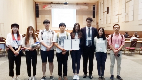 김천대 임상병리학과 분자생물학 연구팀(지도교수 김동찬 박사, 41세)에 소속된 8명의 학부생(서동건, 윤정미, 노휘섭, 문남미, 권효진, 최하민, 이예서, 윤소민)들은 이번 국제학회에 피부 노화 방지, 혈액 노화 방지, 수족냉증 개선, 치매 방지, 탈모 방지 효능을 지닌 다양한 기능성 바이오 신물질 개발에 관한 연구 내용들을 발표하였으며, 특별히 학부 1학년 재학생중인 최하민군와 이예서양이 발표한 “피부 노화 방지 신물질 개발”에 대한 연구 주제가 심사위원들의 높은 평가를 받아 “최우수 학술상”을 수상하게 되었다.