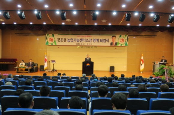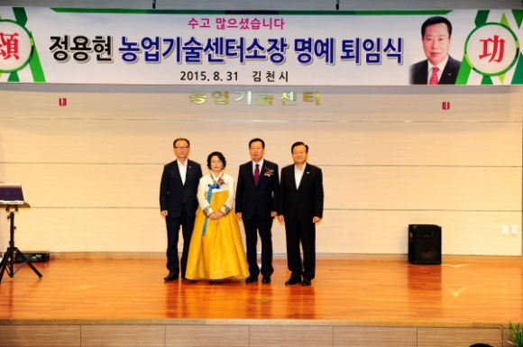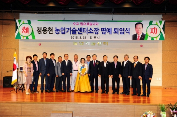 김천시 농업기술센터(소장 박창기)는 8월31일 대강당에서 이철우 국회의원, 박보생 시장, 김병철의장, 임영식 축협조합장, 백종록 산림조합장을 비롯한 지역 농협조합장, 농업관련단체장및 농업인 선후배 ,지인, 가족, 직원들이 참석한 가운데 39년 공직생활을 영광스럽게 마감하는 정용현 소장의 명예퇴임식을 가졌다.