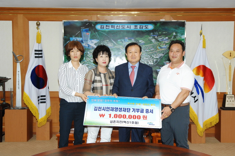 |  | | | ⓒ 김천내일신문 | | 김천의 교육발전을 위해 삼촌치킨 혁신1호점(대표 장재호)에서 김천시인재양성재단(이사장 박보생)에 장학기금 1백만원을 기탁했다.