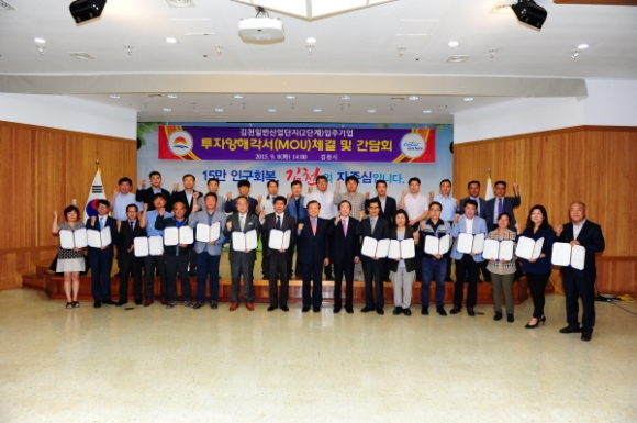 김천시는 일반산업단지(2단계) 입주기업 대표자들과 지난9월8일 시청 3층 강당에서 간담회 및 투자양해각서(MOU) 체결식을 가졌다.