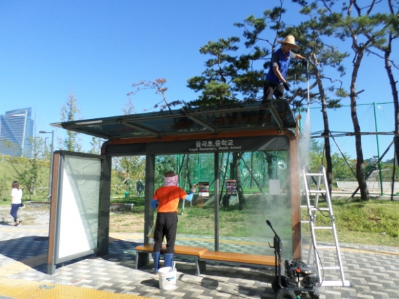 정비대상은 대중교통 이용이 많은 버스․택시 승강장을 중점 대상으로 승강장 지붕, 벽체, 의자에 쌓인 먼지, 묵은 때 등을 스팀분사기를 활용하여 깨끗하게 씻어 내고 기둥이나 벽면에 무분별하게 부착된 전단지, 스티커 등 불법 부착물도 말끔하게 제거한다.