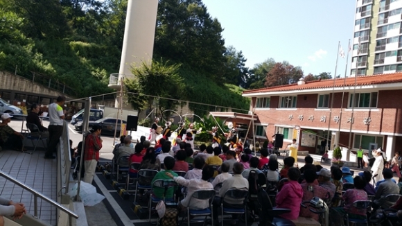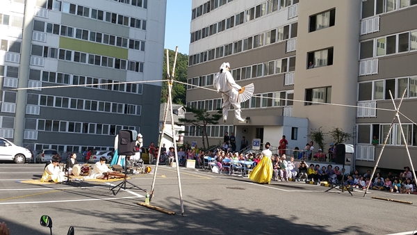 |  | | | ⓒ 김천내일신문 | | 이날 공연은 부곡2주공아파트 주민 등 100여명이 참석하였으며, 길놀이를 시작으로 판굿, 판소리, 전통무용, 민요, 전통줄타기 등의 공연으로 입주민들과 함께 호흡하고 즐기며 문화적 갈증을 해소하였다
