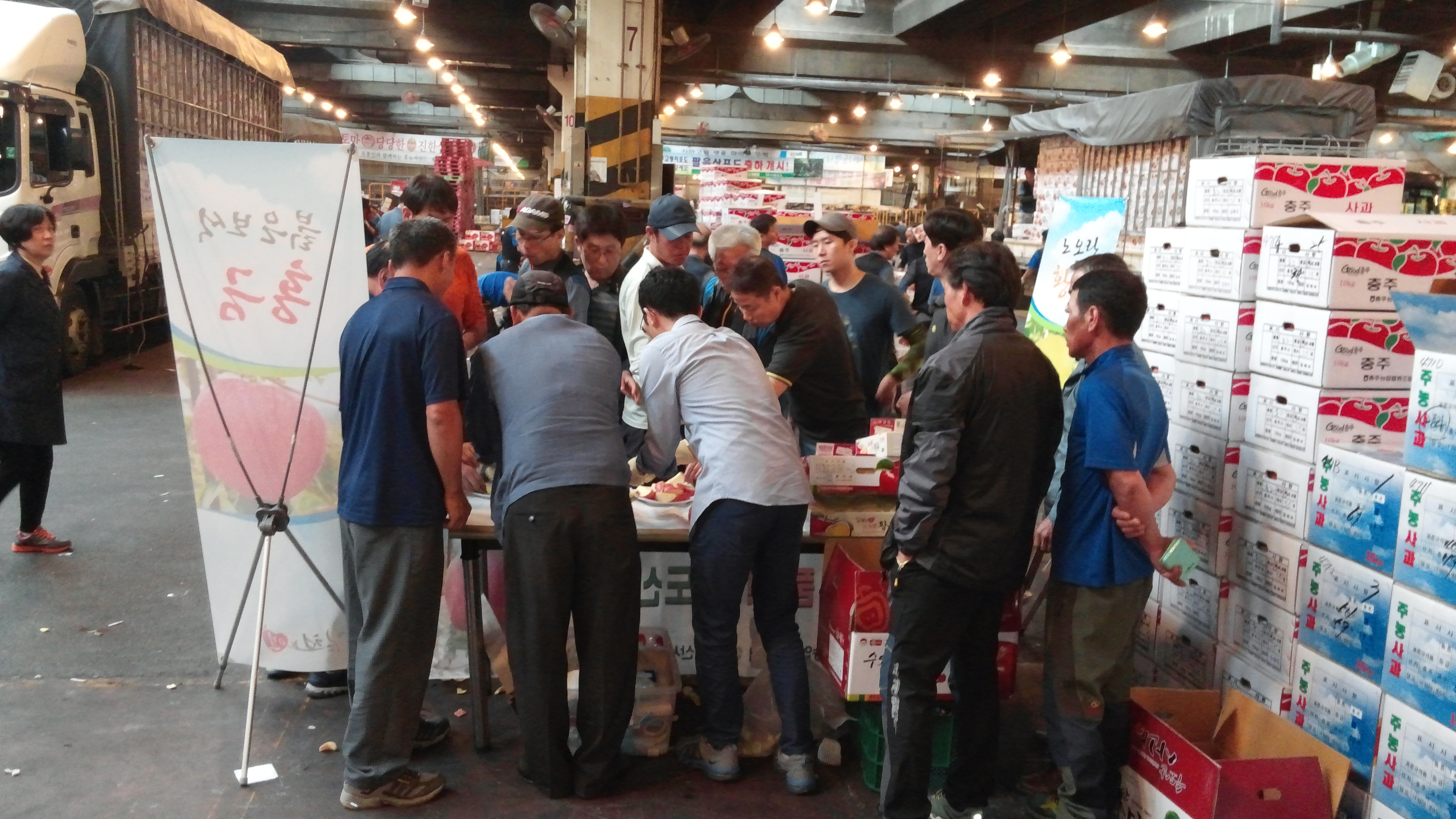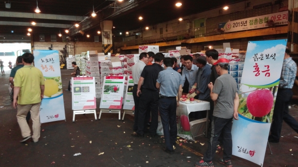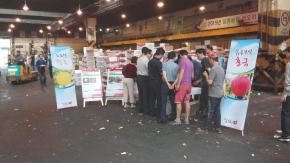 |  | | | ⓒ 김천내일신문 | | 김천시농업기술센터(소장 박창기)에서는 9월 12일 전국최대 도매시장인 가락서울농수산물도매시장에서 중도매인을 대상으로 사과 신품종을 육성한 농촌진흥청 사과시험장 권순일 연구관, 수도산영농조합법인(대표 김근섭) 회원, 연구개발과(과장 강성호) 직원과 공동으로 사과 신품종 홍보 판촉행사를 성황리에 마쳤다고 밝혔다.
