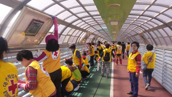 |  | | | ⓒ 김천내일신문 | | 대한적십자 봉사회 김천지구협의회(회장 서성숙) 회원 60명은 지난 9월 14일 김천의 명물 “평화육교”를 민족의 대명절 한가위를 앞두고 묵은 때를 벗겨냈다. 이날, 봉사회원들은 김천시 도로보수원의 고압세척기의 도움을 받아 깨끗이 청소를 실시했다. 본 봉사회는 해마다 우리시의 깨끗한 이미지를 심어주기 위해 명절을 앞두고 평화육교 청소작업을 해 오고 있는 봉사단체이다. 참석한 회원들은 육교내부가 폴리그라스로 덮여 기온이 높아 작업이 힘든데도 불구하고, 추석에 고향을 찾아오는 귀성객들이 가족이나 친지들을 만날 생각을 하면 참을만하다며 걸레를 진 손으로 땀을 닦으며 함박웃음을 지었다.