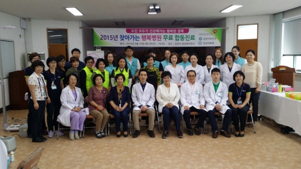 이날 진료는 병원과의 접근성이 떨어지는 산간지역의 독거노인, 거동불편자등 진료를 받기 어려운 환자들을 대상으로 경상북도김천의료원, 국민건강보험공단, 김천시보건소, 김천시중앙보건지소, 김천시종합자원봉사센터에서 40명의 의료진과 봉사자가 참여하여 내과, 안과, 재활의학과, 치과의 진료를 무료로 실시하고 이미용 봉사활동을 진행했다.