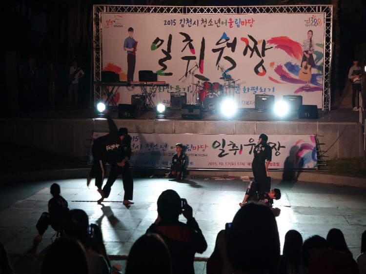 |  | | | ⓒ 김천내일신문 | | 청소년의 다양한 문화활동을 지원하고 청소년이 소통하는 장을 마련하기 위해 김천시가 주최하고 김천시청소년상담복지센터가 주관하는 2015 김천시 청소년 어울림마당 ‘일취월짱’ 세 번째 이야기가 지난 9월 19일 강변공원에서 개최되었다.