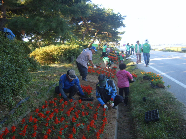 지난 9월 18일 새마을지도자 30명이 참석한 가운데 국도59호 배시내와 선산 경계 꽃밭에서 가을꽃인 메리골드와 사루비아 5,000본을 식재하여 추석 귀성객을 비롯한 통행인에게 큰 즐거움을 주게 되었다.