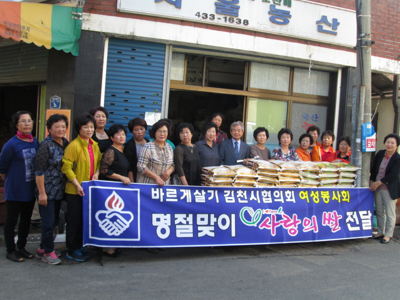|  | | | ⓒ 김천내일신문 | | 바르게살기운동 김천시협의회 여성봉사회(회장 이숙희)는 9월 21일 민족고유의 명절 추석을 맞아 소외된 이웃에게 사랑의 쌀을 전달하였다.