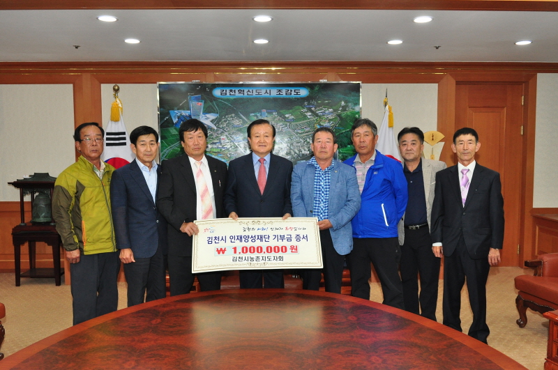김천시농촌지도자회(회장 김홍수)는 지난 9월 21일 김천시청을 방문하여 김천시인재양성재단에 장학금 1백만을 기탁했다.