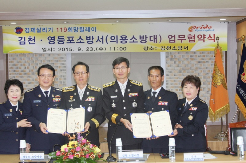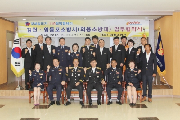 김천소방서(서장 박근오)는 9월 23일 영등포소방서(서장 이홍섭)와 의용소방대 관련 우호교류 협력강화를 위한 업무협약을 체결하였다.