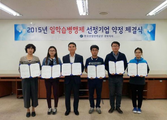 |  | | | ⓒ 김천내일신문 | | 한국산업인력공단 경북지사(지사장 고창용)는 지난 10월 2일 한국폴리텍대학 영주캠퍼스에서 일학습병행제 참여기업으로 선정된 노벨리스코리아(주) 등 6개 기업을 대상으로 훈련실시를 위한 약정 체결식을 가졌다.