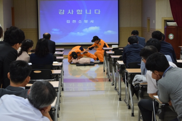 이날 교육은 김천소방서 지좌119안전센터의 주관으로 실시하였으며 화재 시 대처방법에 대하여 설명하고 올바른 대피요령에 대해 설명했다. 뒤이어 심폐소생술 교육의 중요성 및 실제 인명 구조 사례 등을 소개하여 심폐소생술의 필요성을 직원들에게 알린 후 애니인형을 이용하여 실제 심폐소생술 방법에 대해 시연, 실제 응급상황 발생 시 대처 방법에 대하여 교육했다.